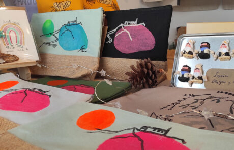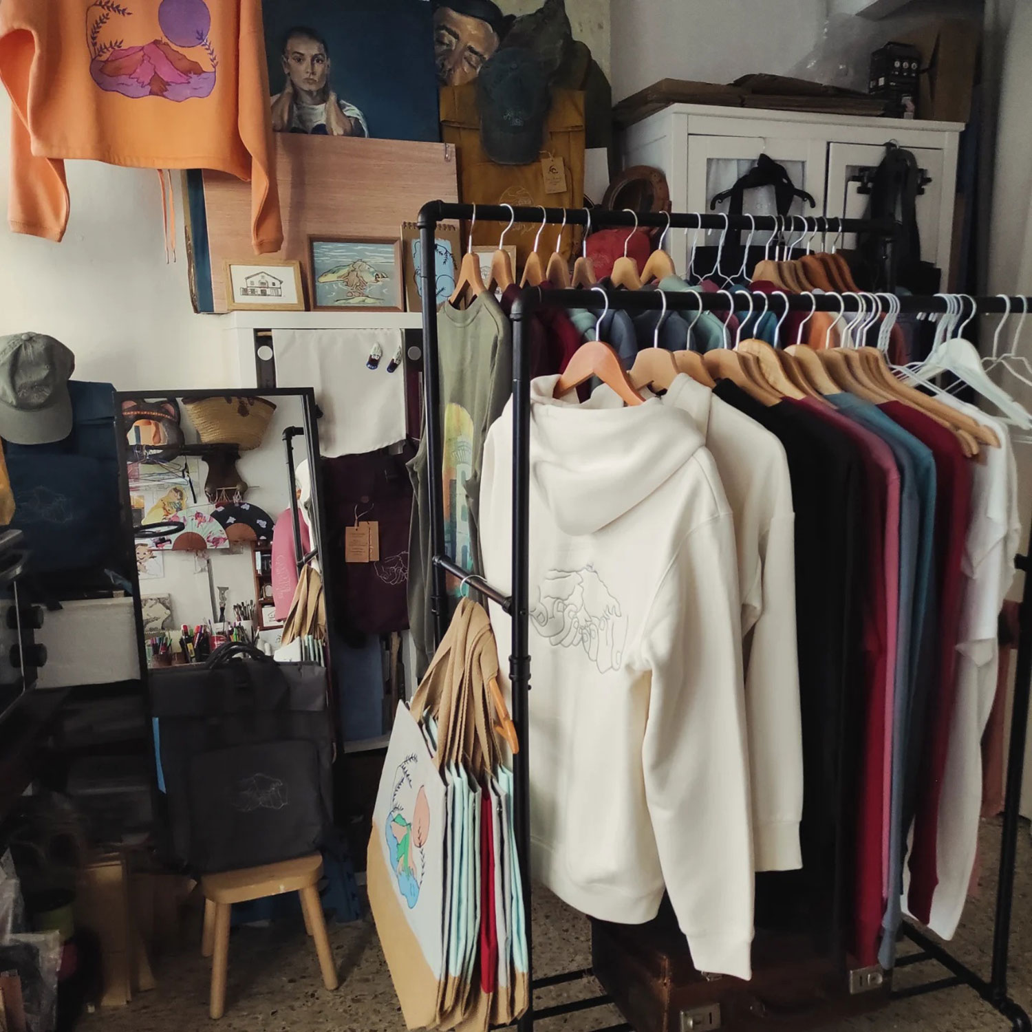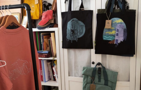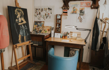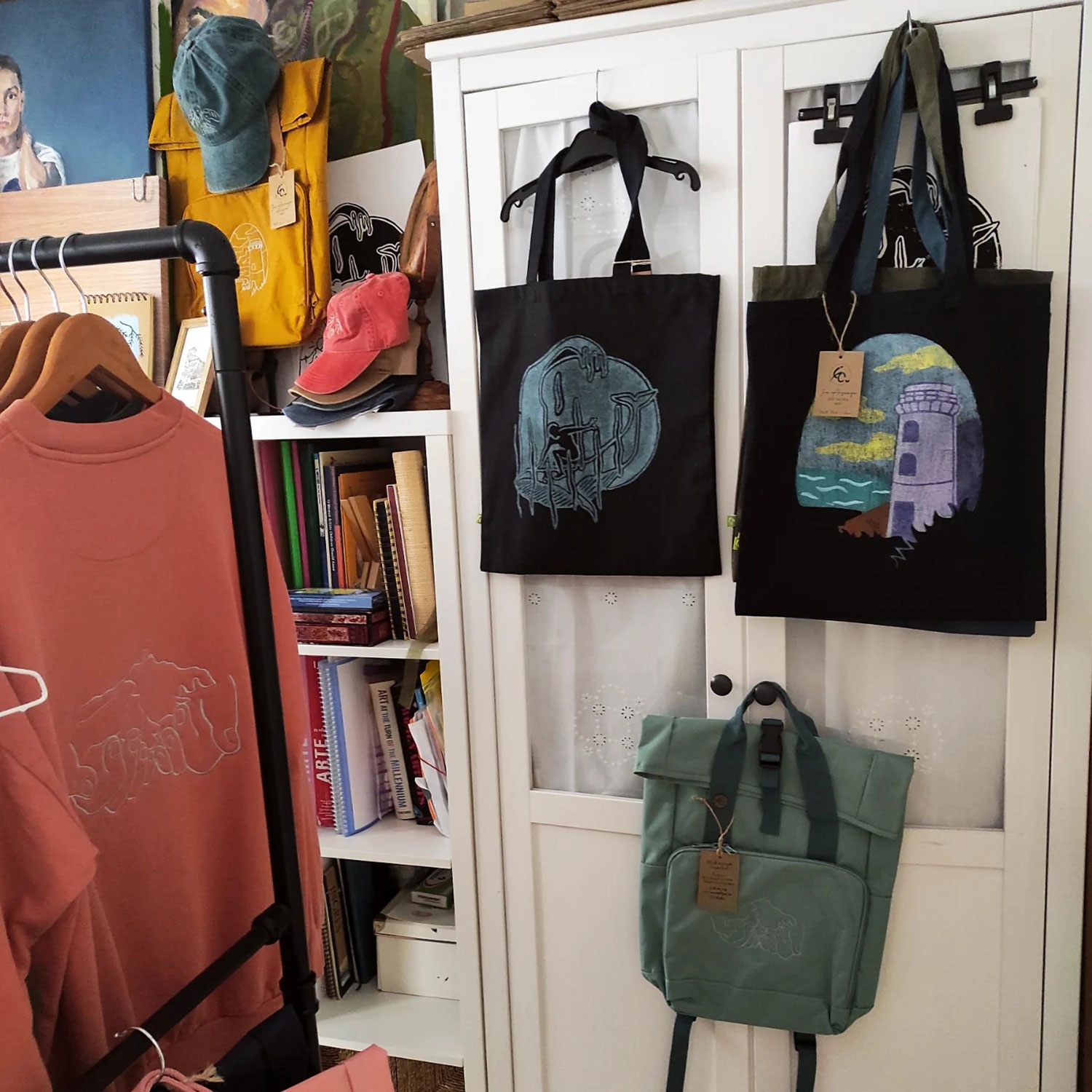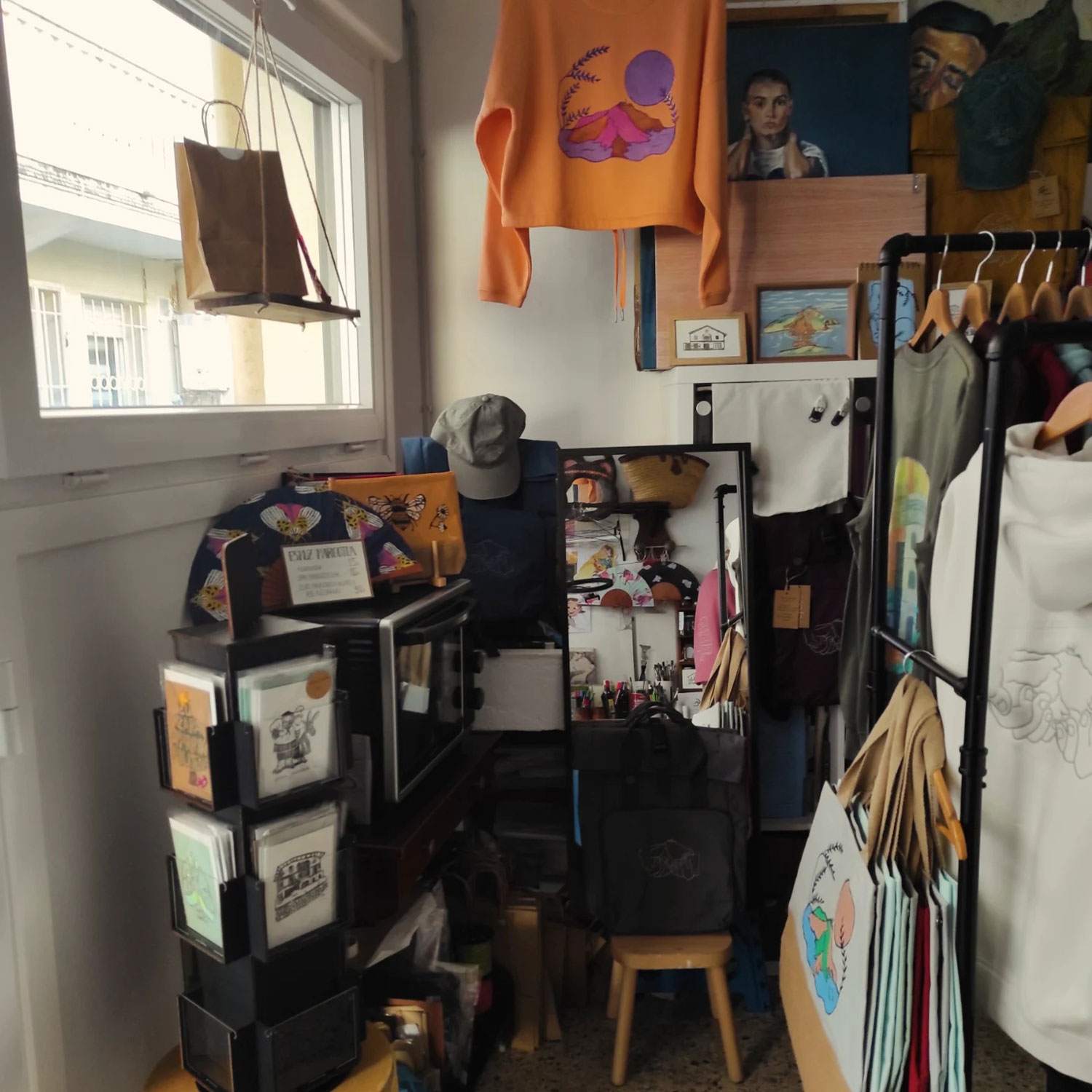 En este taller realizo mis proyectos artísticos y de artesanía. Es un espacio muy pequeño y no está siempre abierto al público por lo que si quieres venir a verme es mejor que contactes antes conmigo. En mi taller puedes probarte las prendas y accesorios que tengo en la tienda online, hacerme preguntas sobre mi trabajo, ver de primera mano las láminas y cuadros y comprar alguno de mis trabajos artesanales no disponibles online.