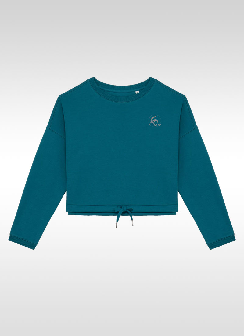 Esta sudadera crop para mujer de color azul petróleo lleva el diseño de San Juan de Gaztelugatxe bordado en la espalda es como un dibujo tejido en hilo, que habla de nuestras raíces y de las imágenes que guardamos en nuestros recuerdos.